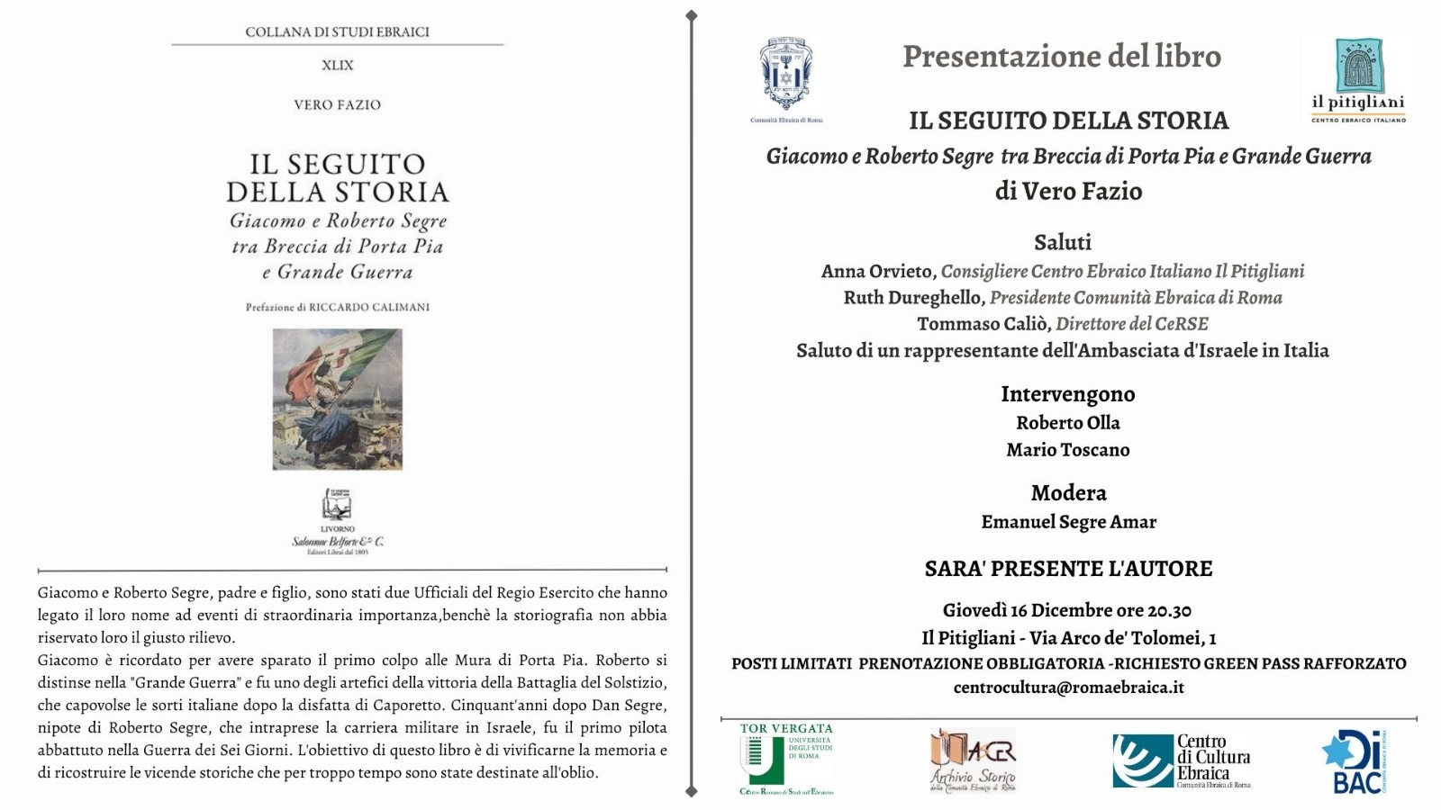 16 dicembre 2021, presentazione del volume : Il seguito della Storia. Giacomo e Roberto Segre fra la Breccia di Porta Pia e la Grande Guerra di Vero Fazio. Invito